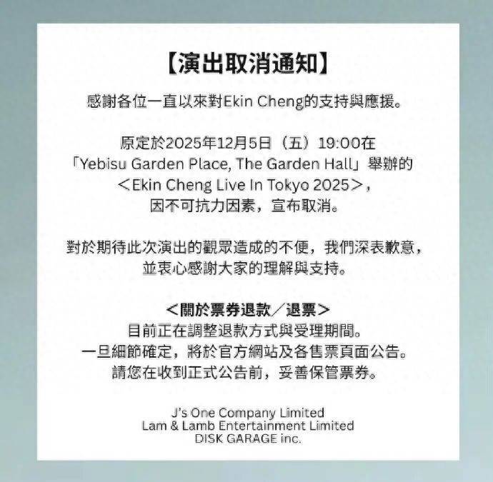 据媒体报道,郑伊健原定于2025年12月5日在日本东京举行的《EKIN CHENG LIVE IN TOKYO 2025》演唱会,25日突然宣布因“不可抗力因素”取消。